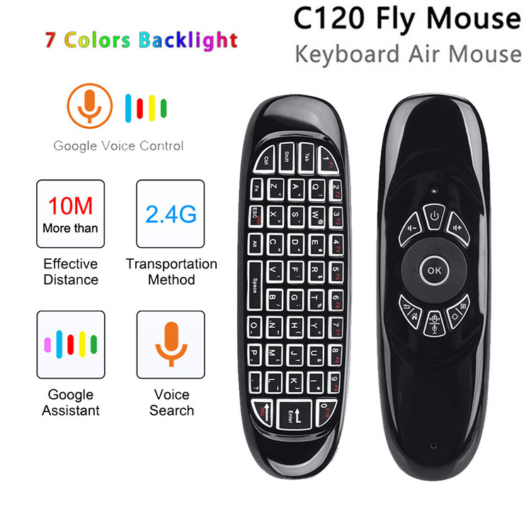 C120 air mouse with 2.4G wireless USB receiver full mini keyboard 3 axis gyroscope 10M working distance, backlit and voice input version optional, Lithium battery inside, support android OS, windows OS, MAC OS and Linux OS.