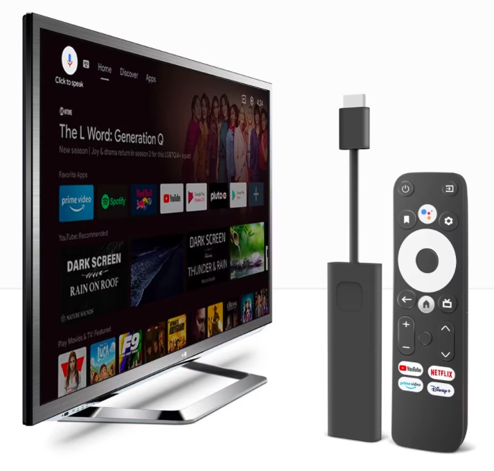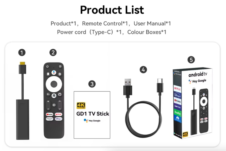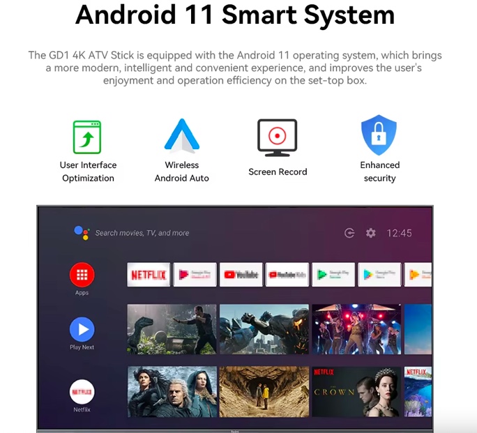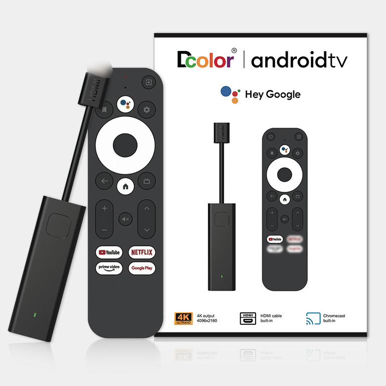 Google Certified DCOLOR GD1 android TV stick with Amlogic S905Y4 Quad Core Cortex A53 chip Mali G31 MP2 GPU 2GB DDR4 16GB eMMC 2.4G 5G 2T2R MIMO WiFi BT 5.0 bluetooth voice remote control 4K 60fps AV1 decoding android 11 ATV OS TV stick.