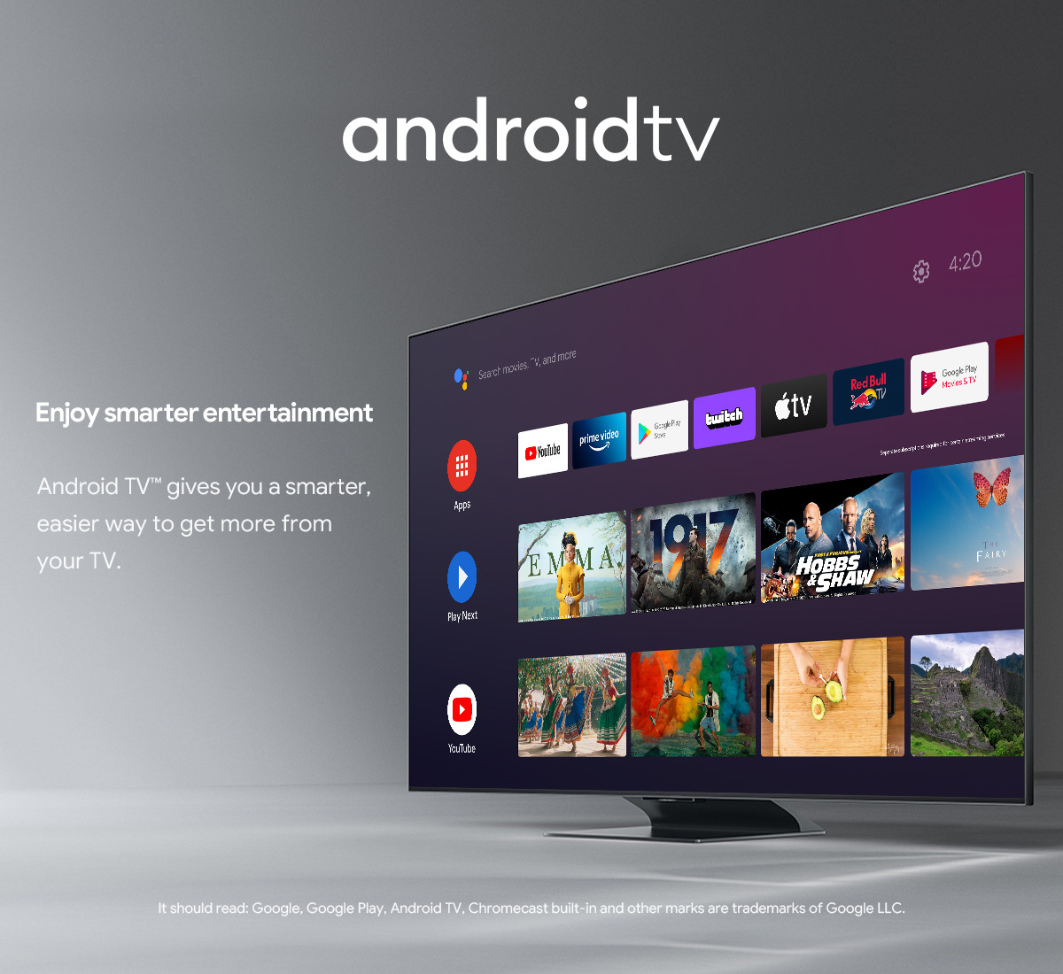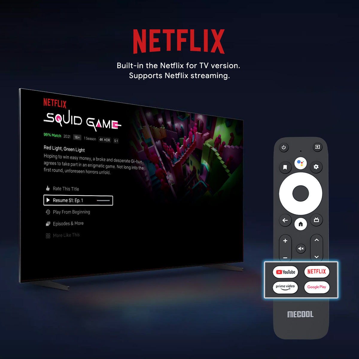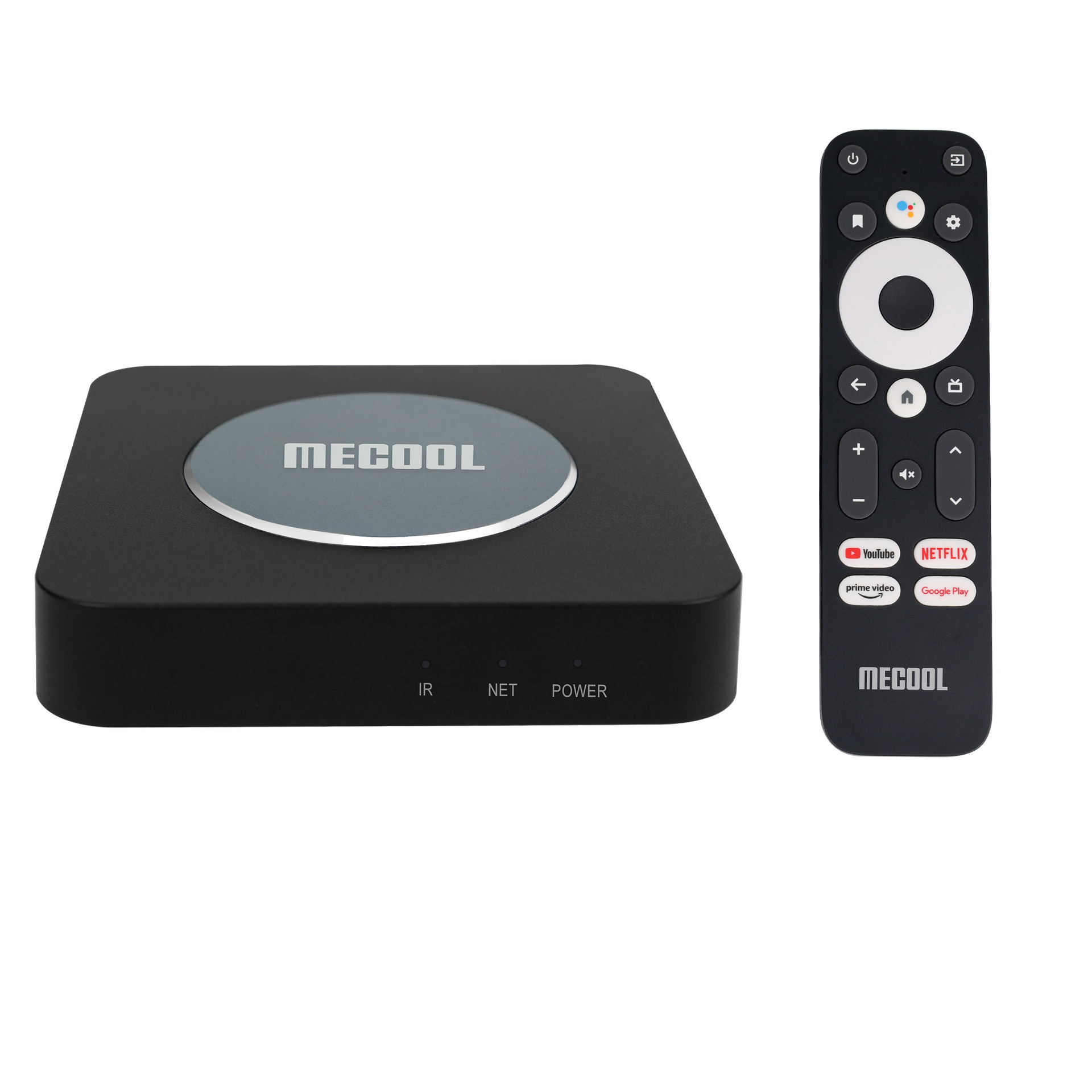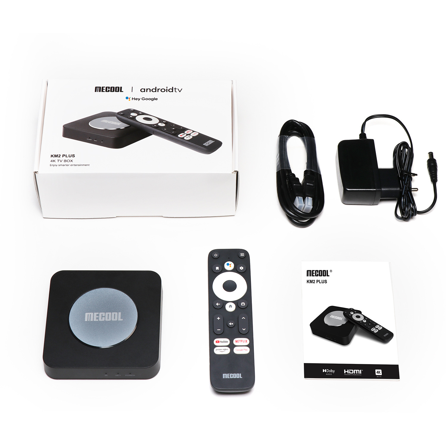 Mecool KM2 Plus ATV android box with Amlogic S905X4-B Quad Core processor 2GB DDR4 16GB eMMC 2.4G 5G dual band WiFi Chromecast built-in AV1 4K 60FPS Dolby Audio support Netflix 4K streaming Google and Netflix certified android 11 ATV OS.
