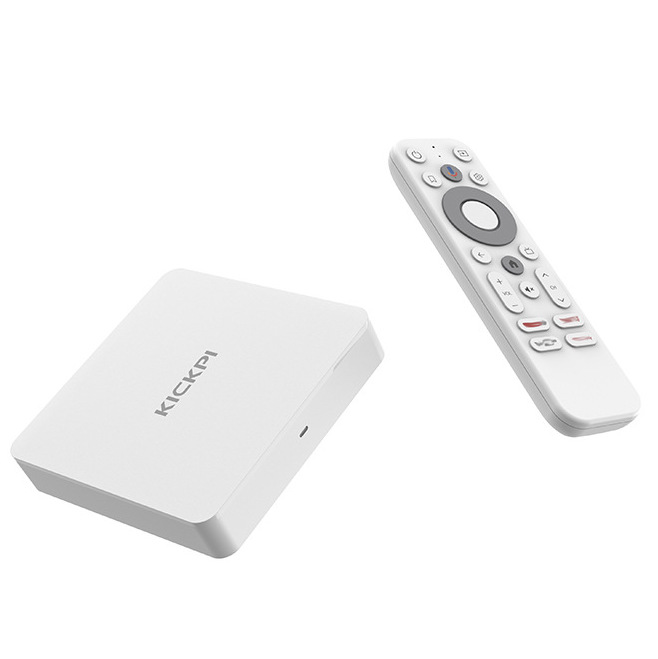 Google Certified KICKPI KP1 androidtv TV box with Quad Core S905Y4 64-bit chip 2GB DDR4 32GB eMMC 2.4G 5G 2T2R dual band WiFi bluetooth 5.0 Dolby Audio and Dolby Digital Plus support 4K 60fps AV1 decoding android 11 ATV OS.