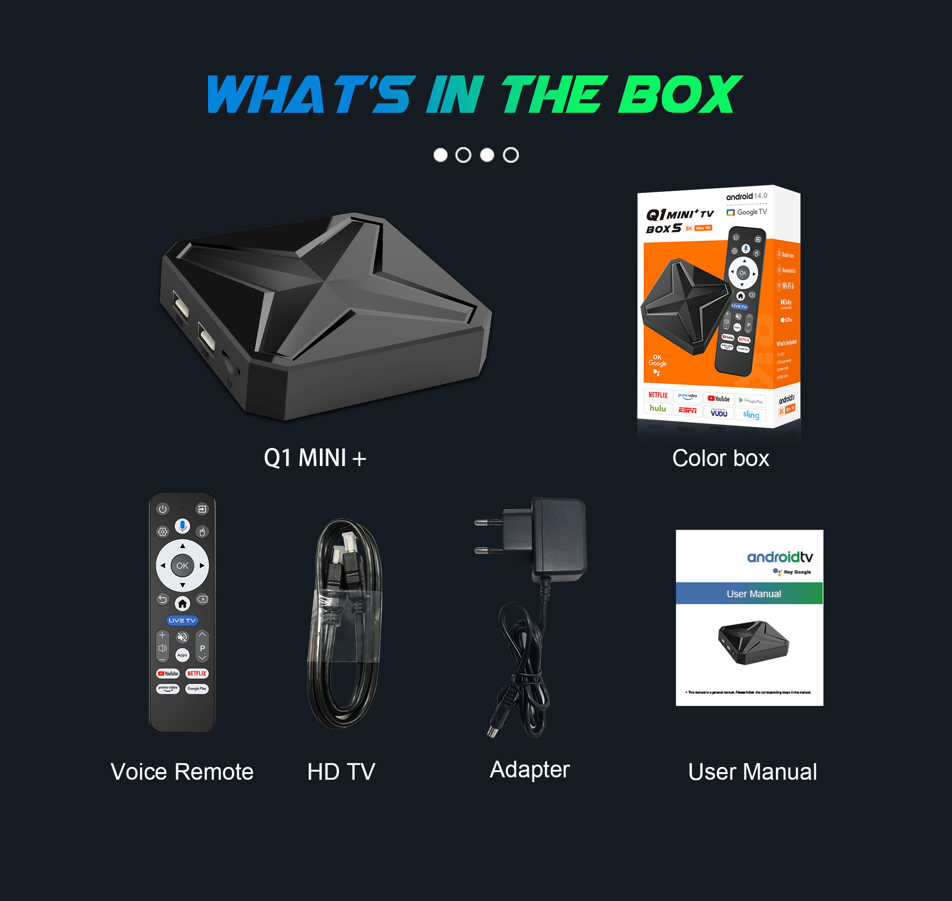 Q1 Mini+ RK3518 android TV box with Rockchip RK3518 Quad Core Chipset Cortex A53 Mali 450 GPU 2GB DDR3 8GB 16GB 32GB eMMC 2.4G 5G WiFi6 Bluetooth5.4 USB3.0 4K@60fps decoding BT remote control android 14 androidtv OS TV box.