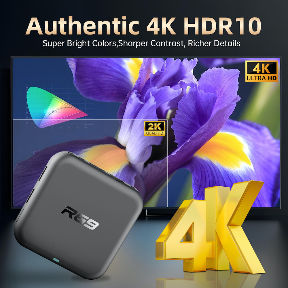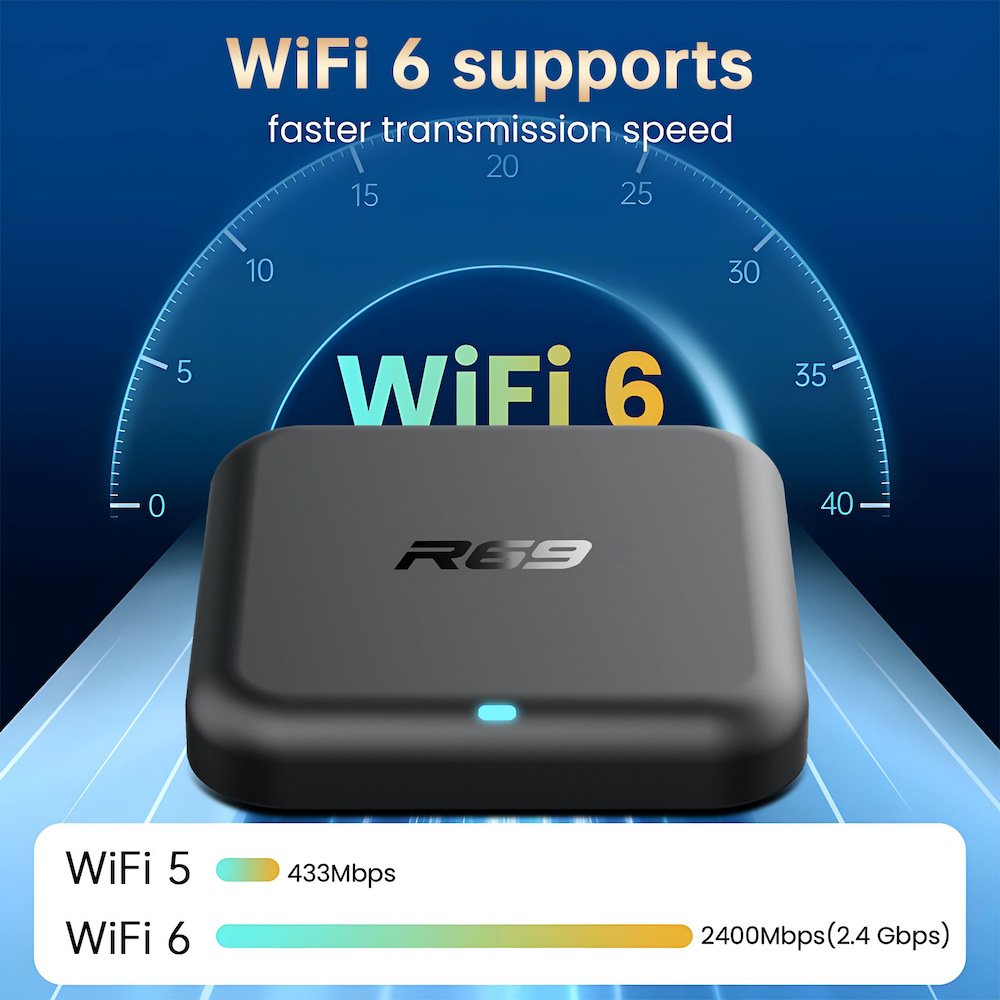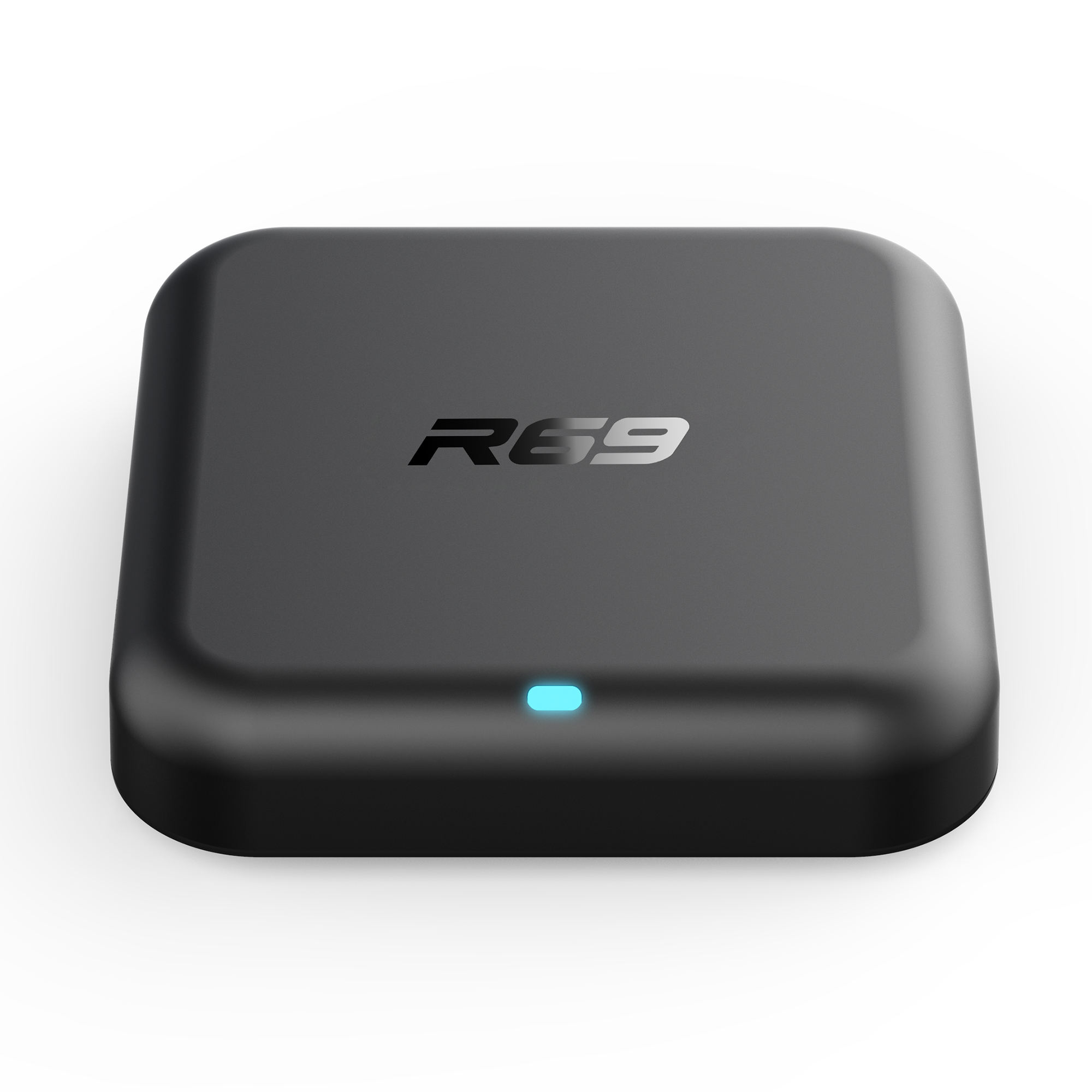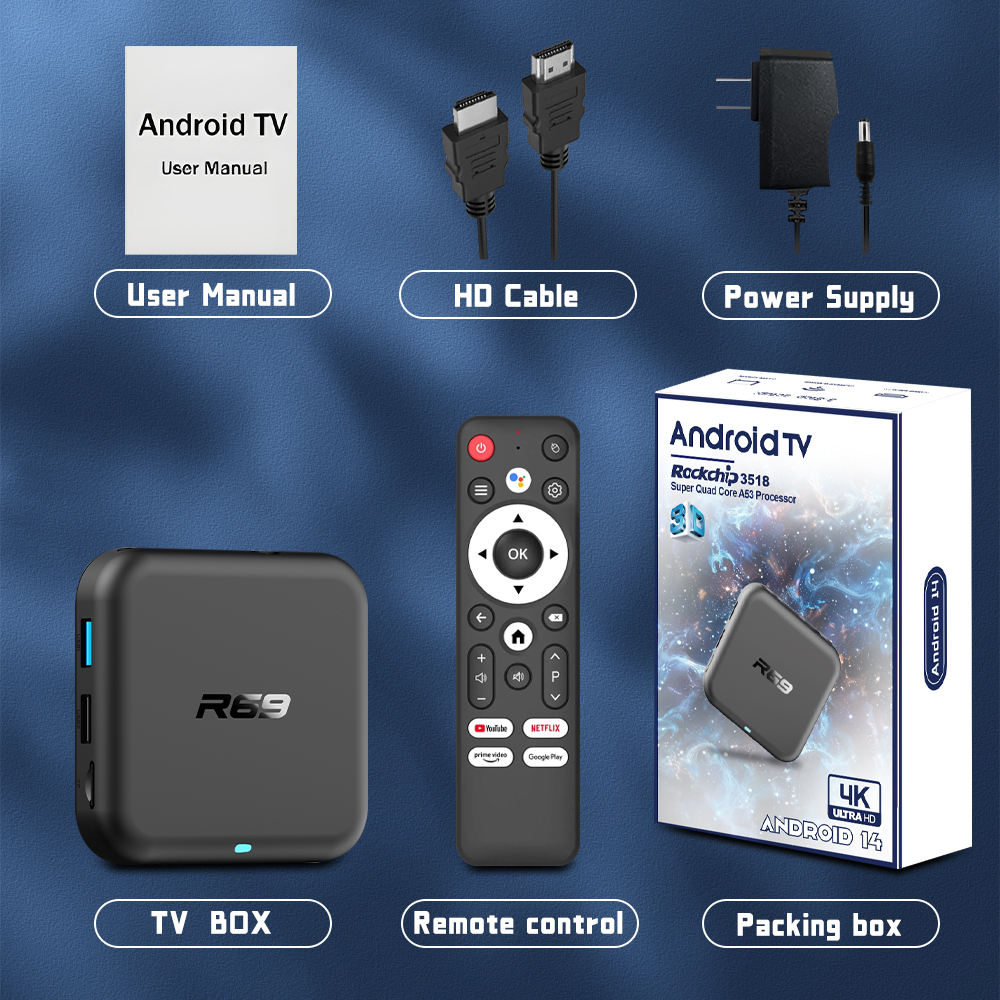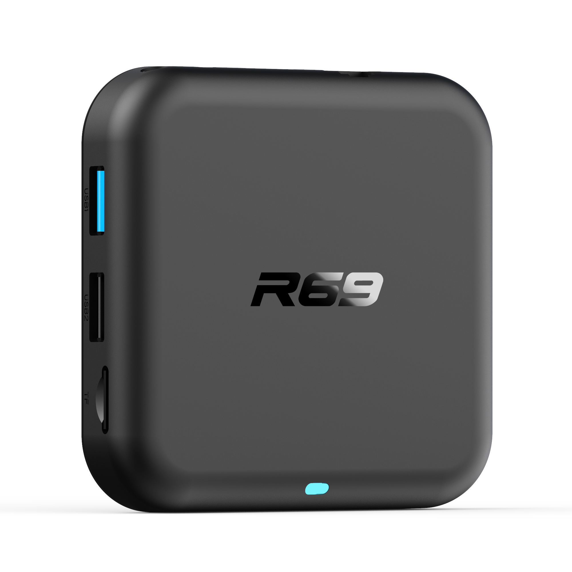 R69 RK3518 android box with Quad Core Rockchip RK3518 CPU Cortex A53 GPU Mali 450 2GB DDR 8GB 16GB 32GB eMMC 2.4G 5G WiFi6 Bluetooth 5.0 USB 3.0 support 4K 60fps video smart voice remote control android 14 ATV OS.