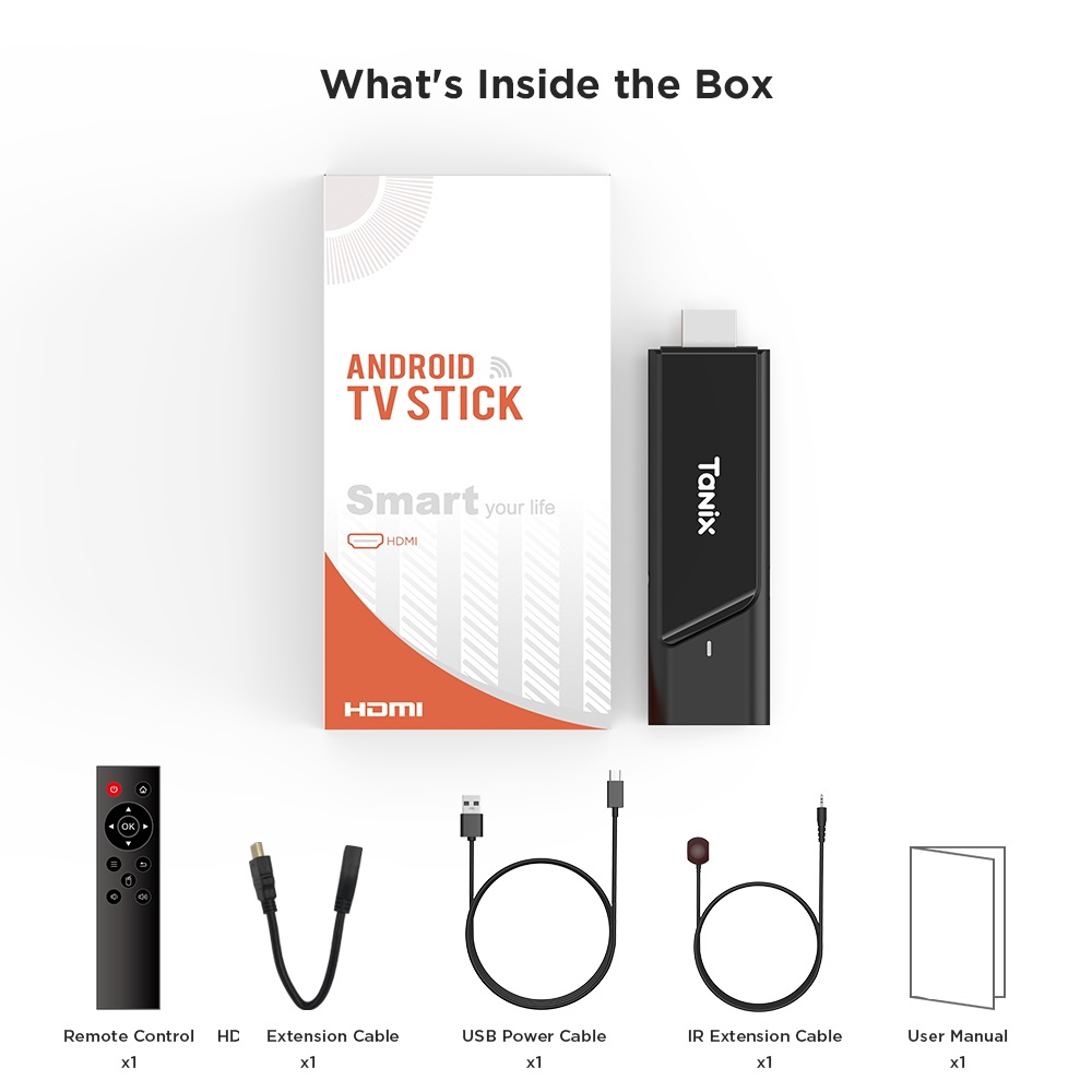 TV Stick x 1, Remote Control x1, HD Cable x1, USB Power Cable x1, IR Extension Cable x 1, User Manual x1