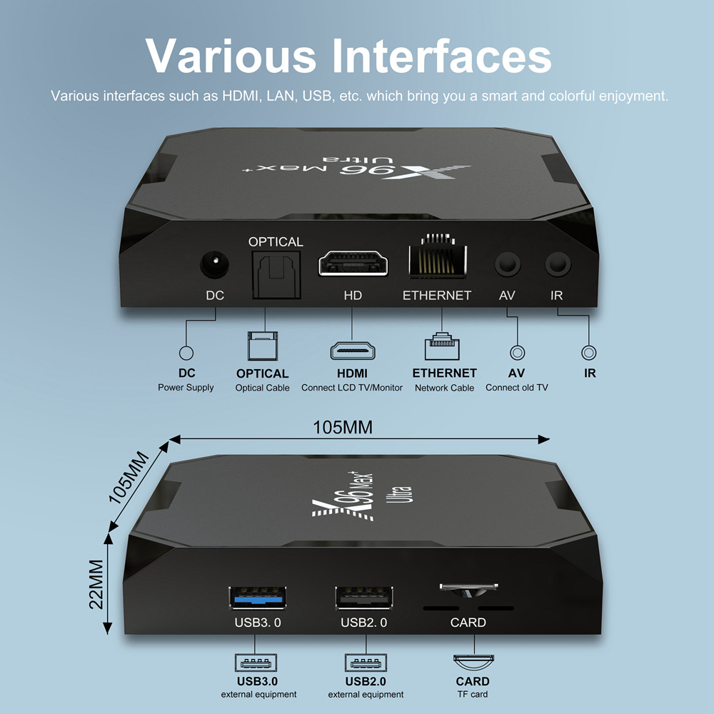 8K X96 Ultra streaming smart box with Amlogic S905X4 Cortex A55 Quad Core 64 bit Chip Mali G31 MP2 GPU 4GB DDR4 32GB 64GB eMMC storage 2.4G 5G 802.11 ac dual band WiFi Bluetooth 4.X 8K 24fps HDR 10+ AV1 video decoding android 11 OS streaming smart box.