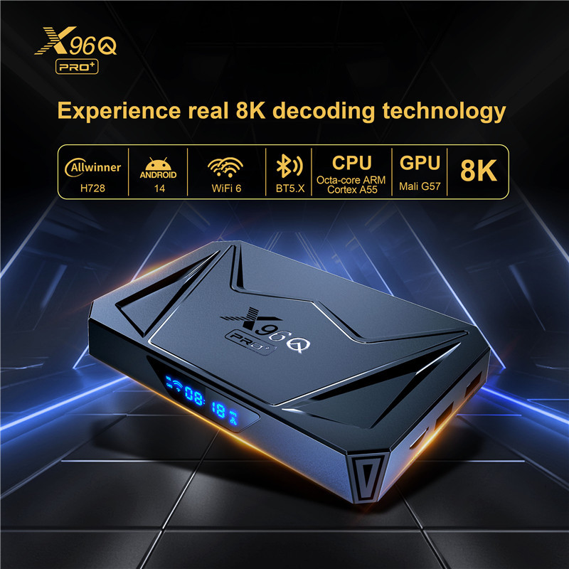 X96Q Pro+ 8K android TV box with Allwinner H728 Octa Core CPU Mali G57 GPU 2GB 4GB DDR 16GB 32GB Flash 1000M Ethernet WiFi 6 BT 5.X android 14 OS real 8K android TV box.